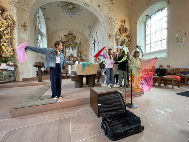 Die Religionskinder der dritten Klassen hatten dafür einen Koffer mit Tüchern und kleine Texte vorbereitet. Dabei machten sie deutlich, wie vielfältig so ein Tuch einsetzbar ist. Vor allem am gemeinsamen Singen hatten die Kinder sehr viel Freude. Den Abschluss des Gottesdienstes bildete die besondere Segnung der Viertklässler, die unsere Schule nun in Richtung weiterführender Schule verlassen.