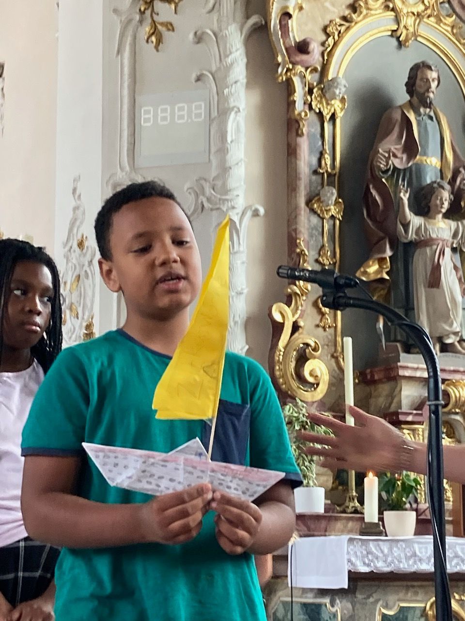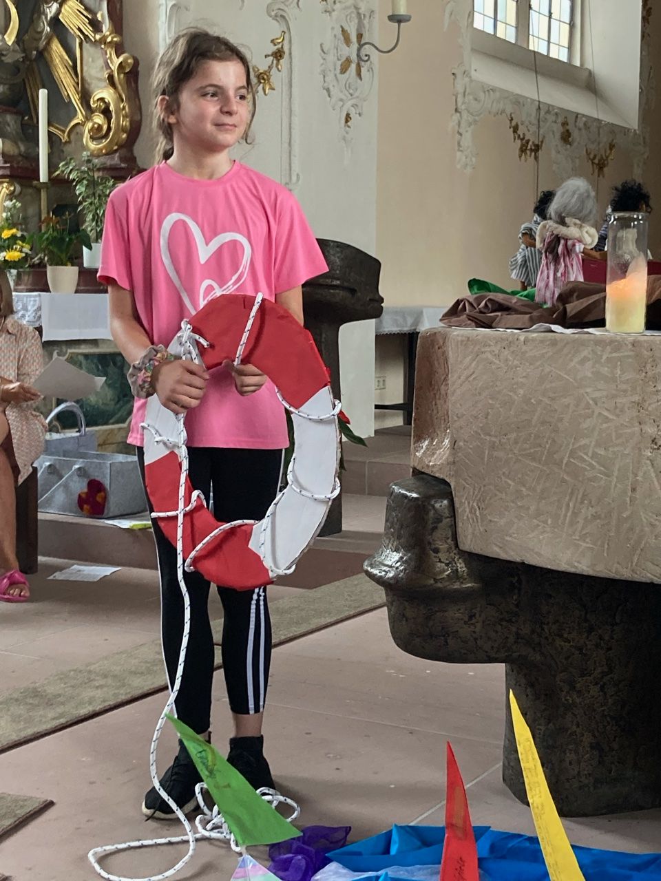 Die Klasse vier bastelte Boote mit Gedanken über die vergangenen Schuljahre und ließ diese auf dem Altar segeln. Die dritten Klasse gaben zur Verabschiedung ihrer Religionslehrerin Tina Eiermann, viele Gute Wünsche mit auf den Weg. Mit einer Fürbitte schickte die zweite Klasse alle sicher „auf große Fahrt“. Die erste Klasse rundete den Gottesdienst mit einem meditativen Tüchertanz ab. Wie in jedem Jahr, bekamen die Viertklässler von ihren Religionslehrerinnen einen Segen und gute Wünsche mit auf den Weg.