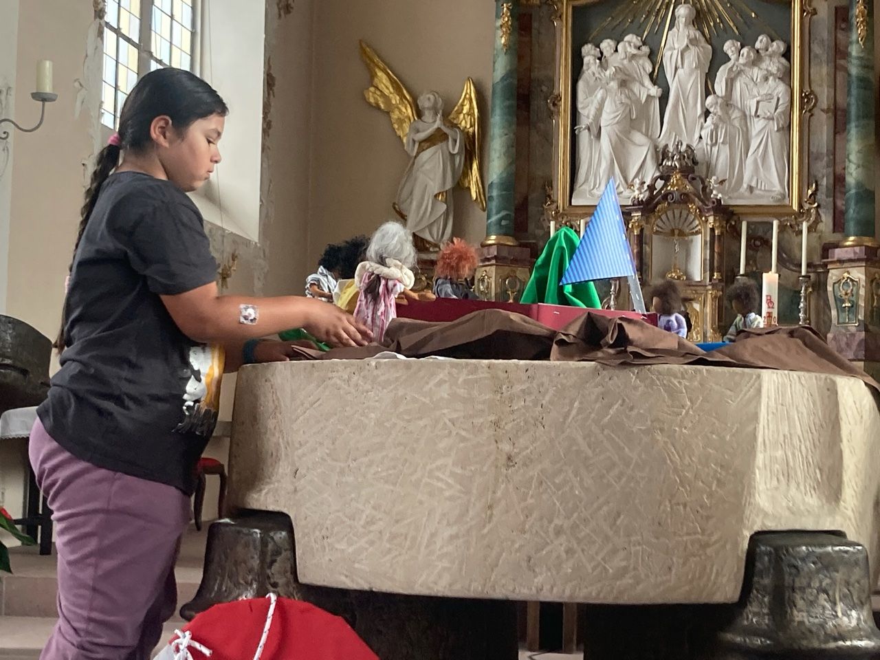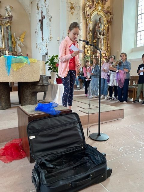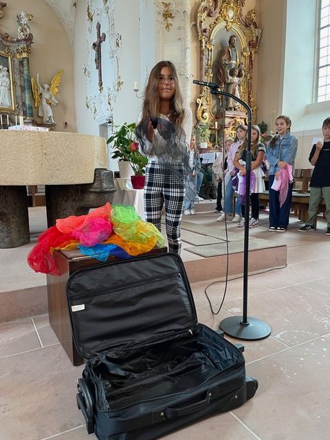 Die Religionskinder der dritten Klassen hatten dafür einen Koffer mit Tüchern und kleine Texte vorbereitet. Dabei machten sie deutlich, wie vielfältig so ein Tuch einsetzbar ist. Vor allem am gemeinsamen Singen hatten die Kinder sehr viel Freude. Den Abschluss des Gottesdienstes bildete die besondere Segnung der Viertklässler, die unsere Schule nun in Richtung weiterführender Schule verlassen.