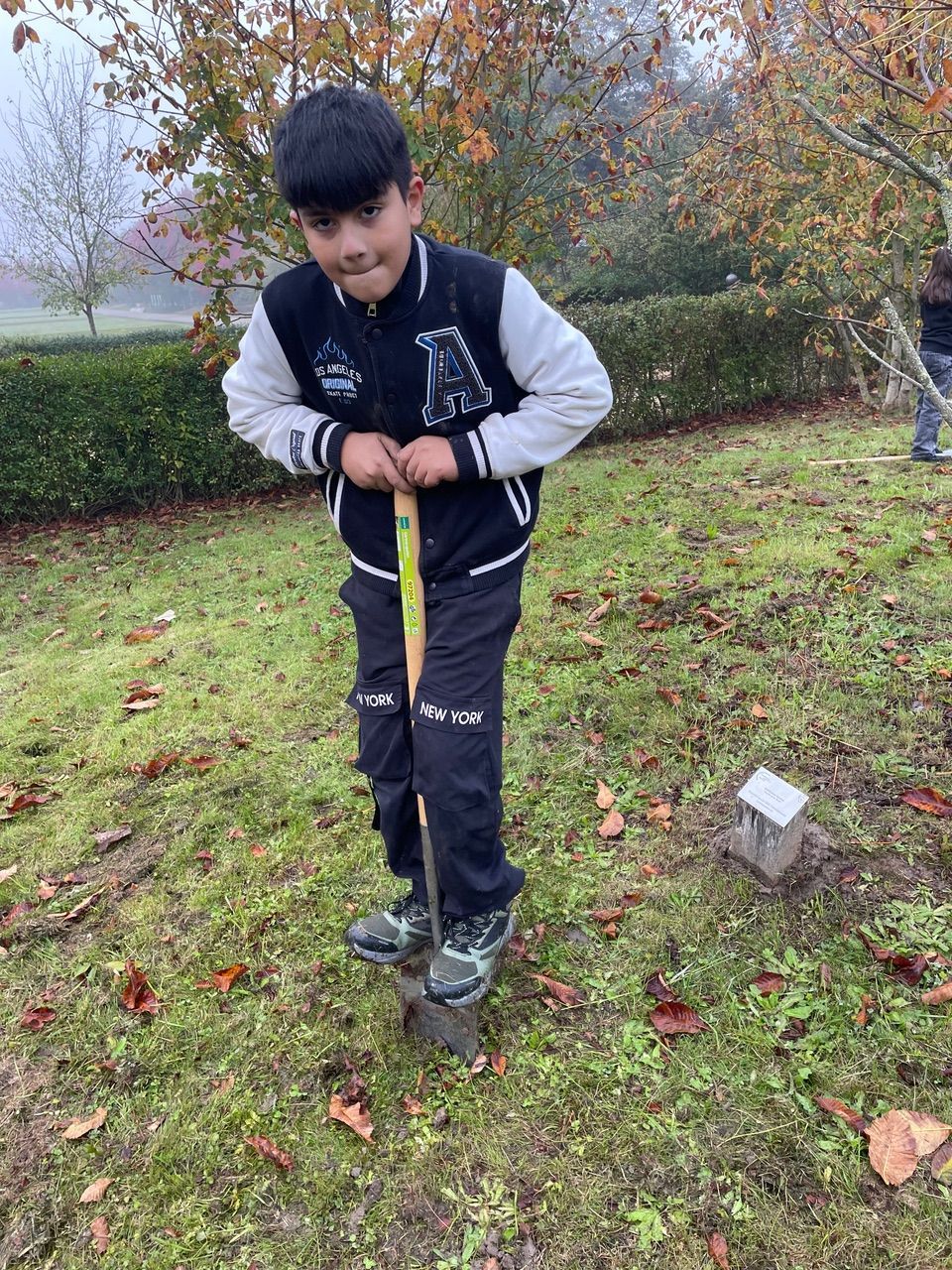 Mit Spaten und Handschuhen ausgerüstet liefen wir zum Treffpunkt am Römerhaus in den Bürgerpark. Die Helfer der „Freunde der Landesgartenschau“ empfingen uns herzlich und überreichten uns eine Kiste mit 600 von insgesamt 9000 Narzissenzwiebeln. Nach einer kurzen Einführung packten alle tatkräftig mit an. Loch graben, 3 oder 5 Blumenzwiebeln einlegen, Loch schließen, Erde festtreten – so machten wir es immer wieder. Die Jacken wurden schnell auf die Seite gelegt. Arbeit macht warm!